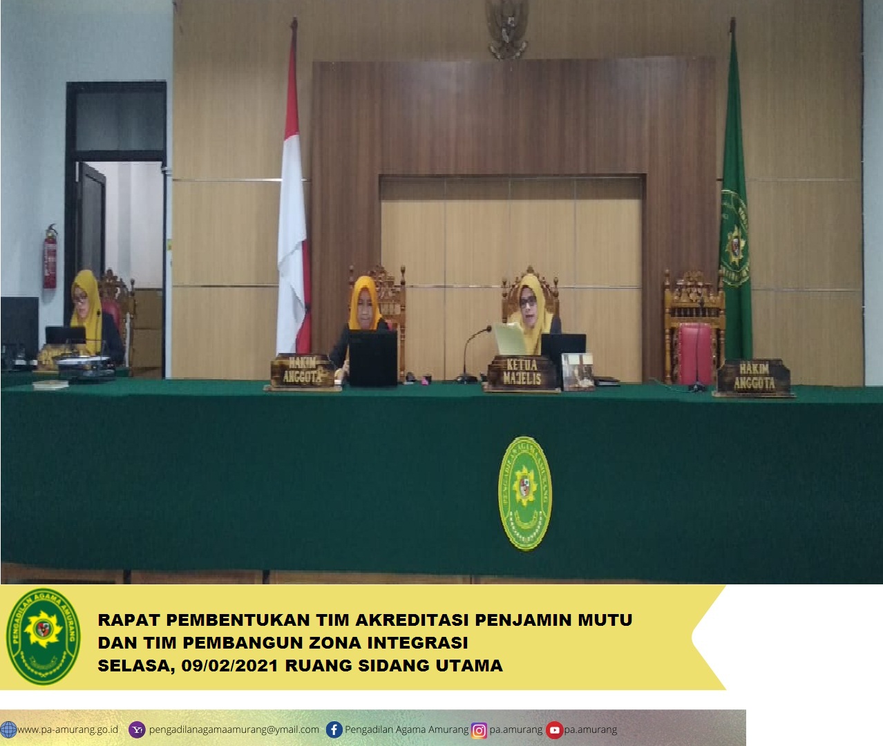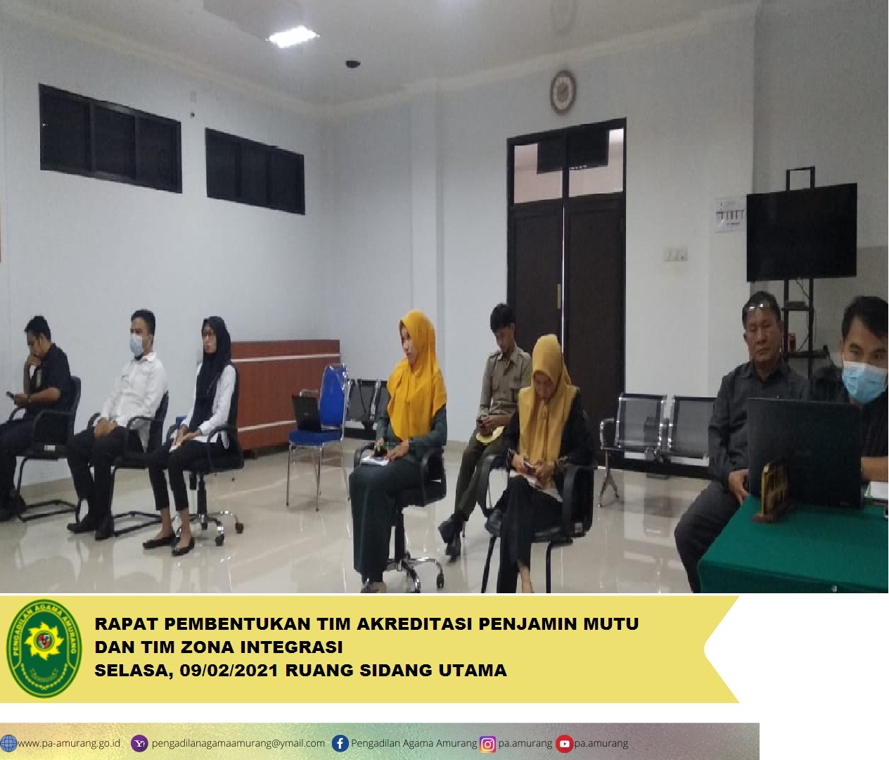 Pengadilan Agama Amurang melaksanakan Rapat Tim Akreditasi dan Tim Zona Integrasi (09/2) di Ruang Sidang Utama Pengadilan Agama Amurang yang dipimpin langsung oleh Ketua Pengadilan Agama Ibu Nur Afni Saimima, dan diikuti oleh Wakil Ketua, Hakim, Pejabat Struktural dan Fungsional, serta seluruh pegawai Pengadilan Agama Amurang.