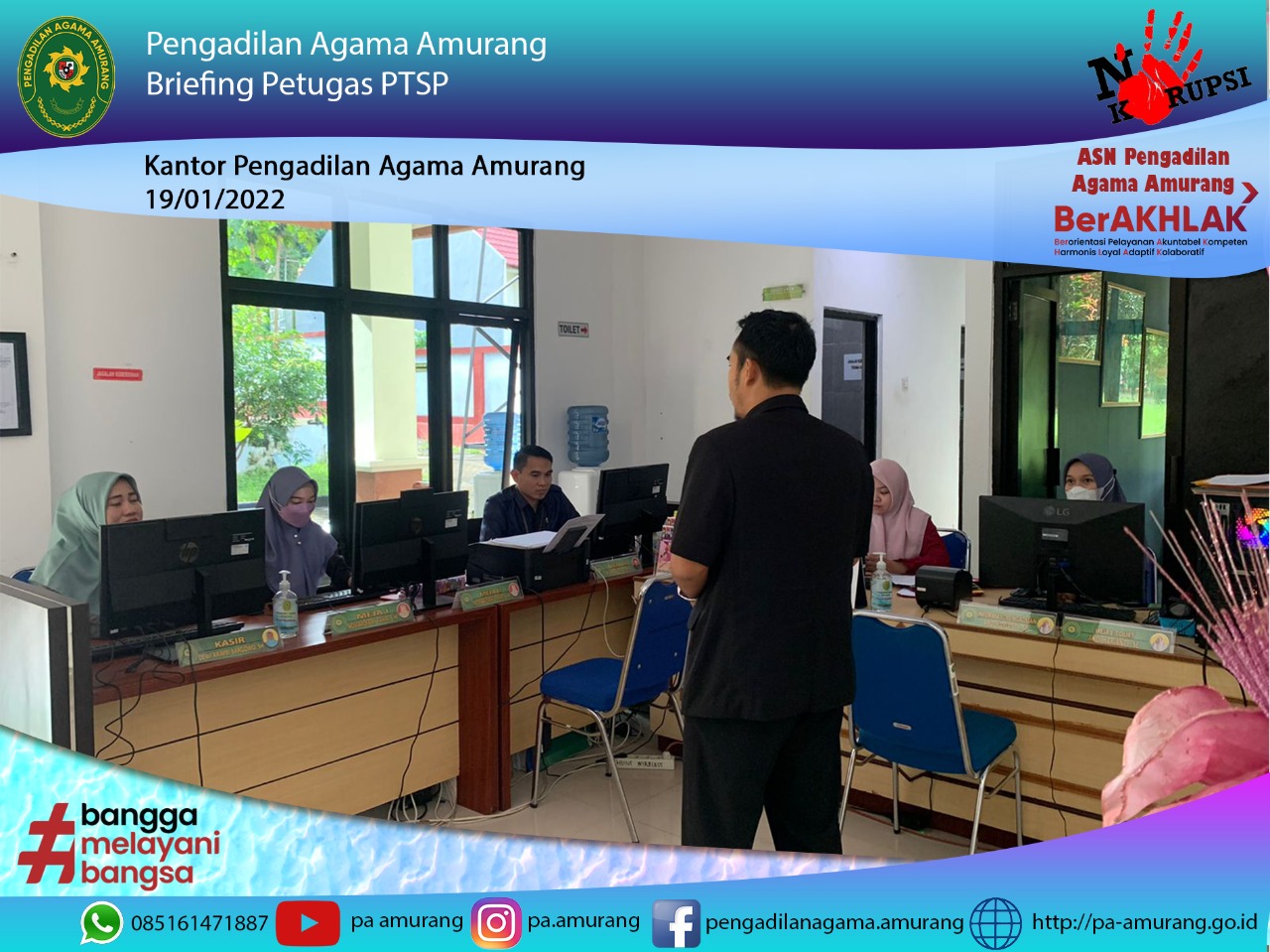 Rabu, 19 Januari 2022, pukul 08.30 WITA, bertempat di ruang PTSP Pengadilan Agama Amurang, Hakim Pengawas Bidang, Jauharil Ulya, S.H.I., M.Sc, memberikan Morning Briefing kepada petugas PTSP Pengadilan Agama Amurang.
