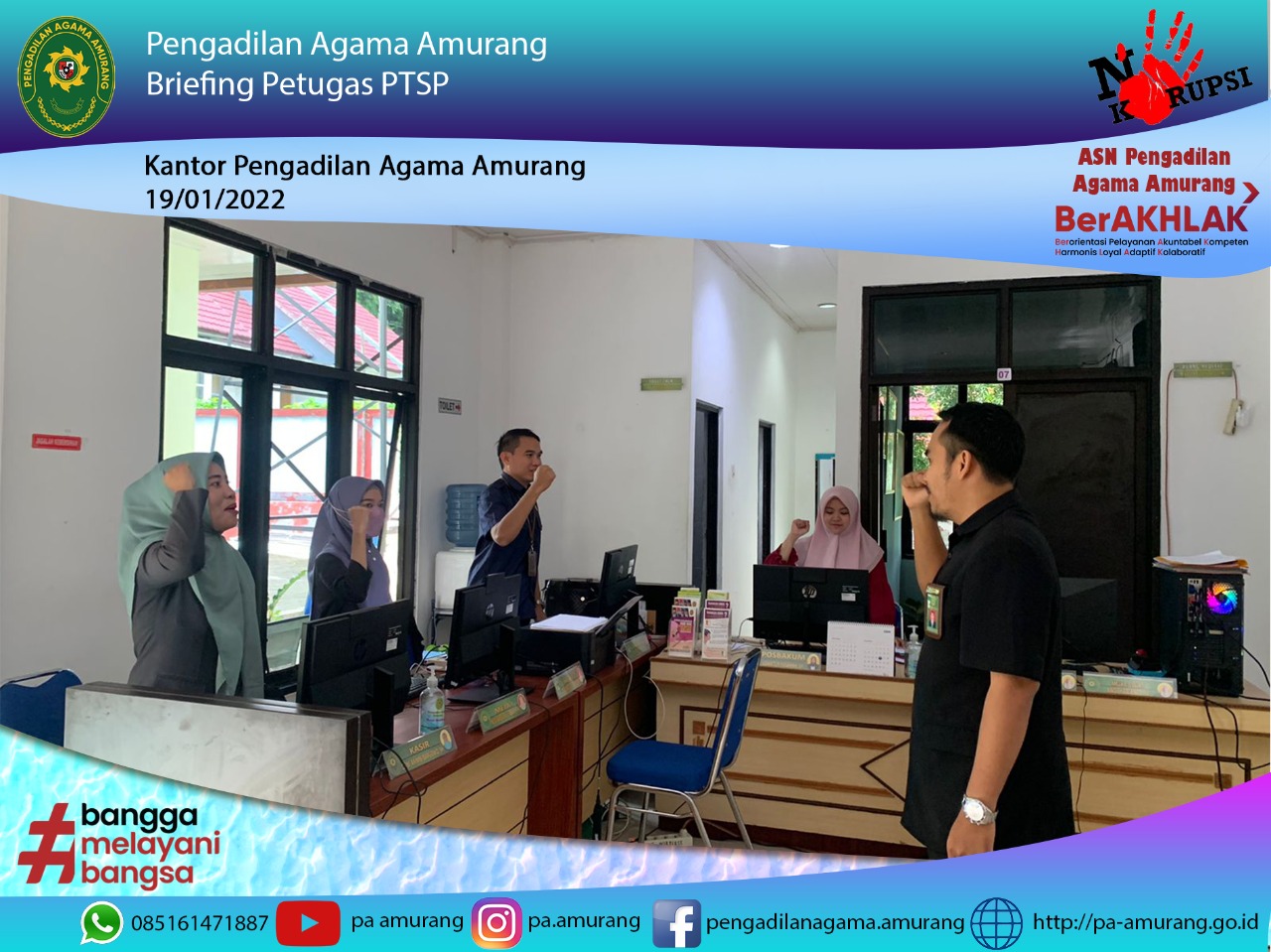 Kegiatan tersebut merupakan agenda rutin setiap hari dalam rangka meningkatkan pelayanan pada masyarakat pencari keadilan. Dalam briefing tersebut, para petugas mendapat arahan untuk selalu membagikan kuisioner Indeks Presepsi Korupsi dan Indeks Kepuasan Masayarakat kepada masyarakat pencari keadilan dan juga hal ini merupakan termasuk dalam penilaian Zona Integritas.